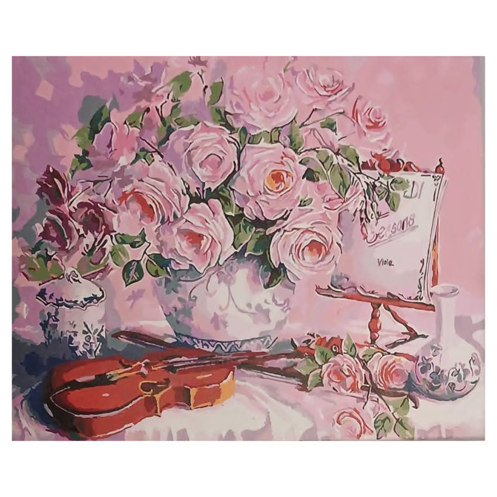 Soft hues of pink and delicate brushstrokes bring this breathtaking floral arrangement to life. “Harmony in Bloom” captures the elegance of roses in full bloom, gracefully arranged alongside a classical violin, symbolizing the perfect blend of music and nature. Every detail, from the intricate vase patterns to the gentle play of light and shadow, reflects Kevin Jones’ remarkable talent and perseverance.