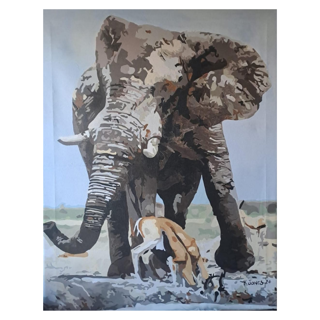 Step into the heart of the African wilderness with this breathtaking painting of an elephant standing tall over a graceful antelope. This artwork embodies the raw power and gentle wisdom of nature, capturing a moment of coexistence between two incredible species. With earthy tones and masterful shading, this piece brings depth, realism, and a sense of untamed beauty to any space.