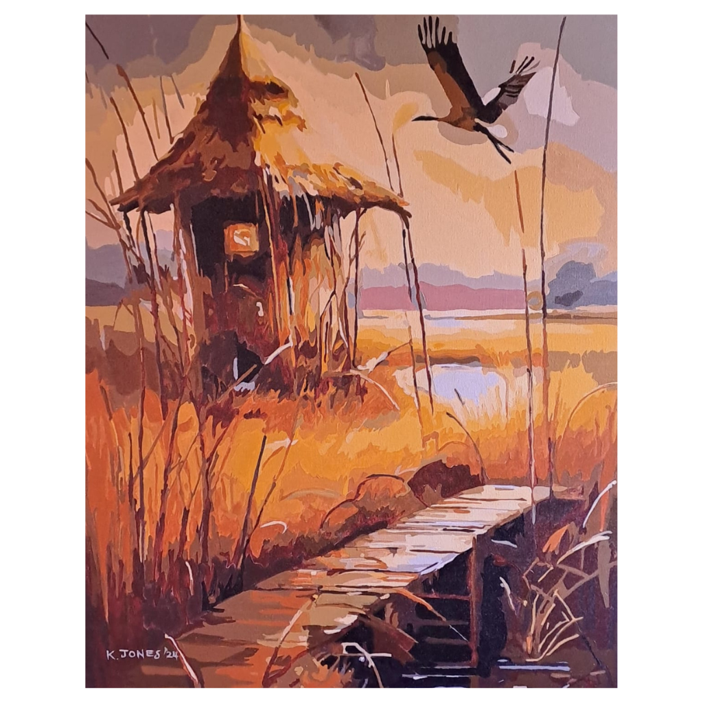 Step into a world of peace and solitude with this captivating painting of a rustic hut nestled in golden marshlands. The warm hues of amber, ochre, and deep brown evoke the glow of a setting sun, while a lone bird takes flight, adding movement and freedom to the scene. The winding wooden path invites you to wander into this hidden retreat, a place untouched by time and full of quiet serenity.