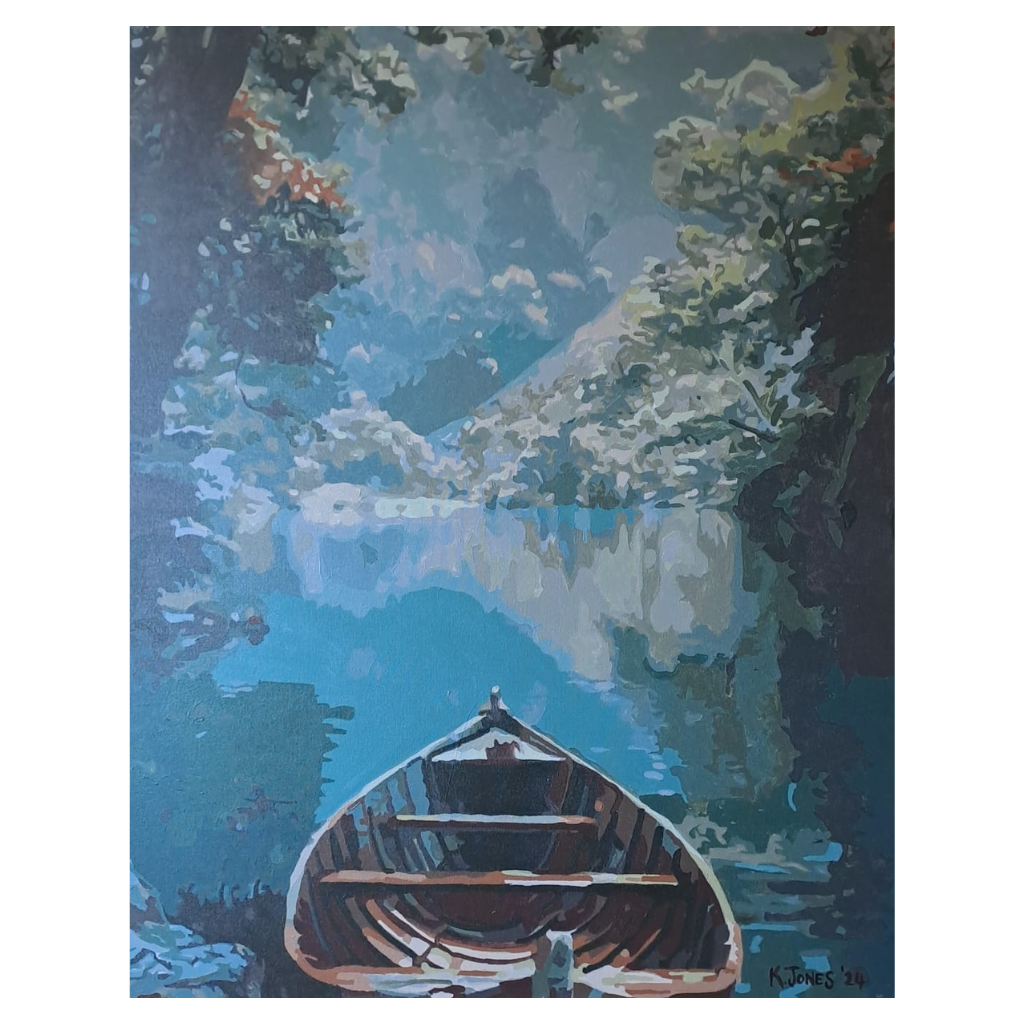 Drift into a world of peace and reflection with this breathtaking painting of a wooden boat floating on a still, glass-like lake. The cool blues and lush greens create an atmosphere of tranquility, inviting you to imagine yourself on a quiet journey through nature’s untouched beauty. The soft reflections of trees and mountains in the water add depth and serenity, making this piece a mesmerizing addition to any space.