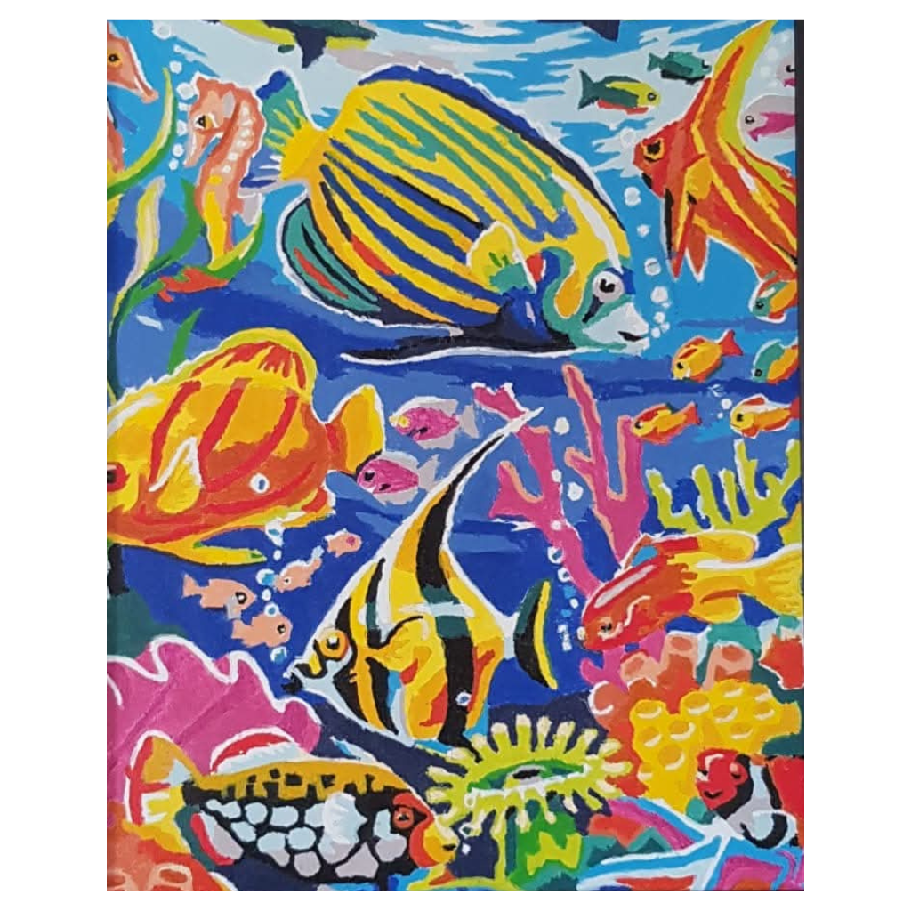 Dive into a mesmerizing world of marine beauty with this electrifying underwater scene. Bursting with color, this painting showcases a variety of exotic fish swimming amongst lively coral reefs, bringing the vibrancy of the ocean to life. The bold blues, radiant yellows, and striking reds create a captivating composition that will brighten any space.