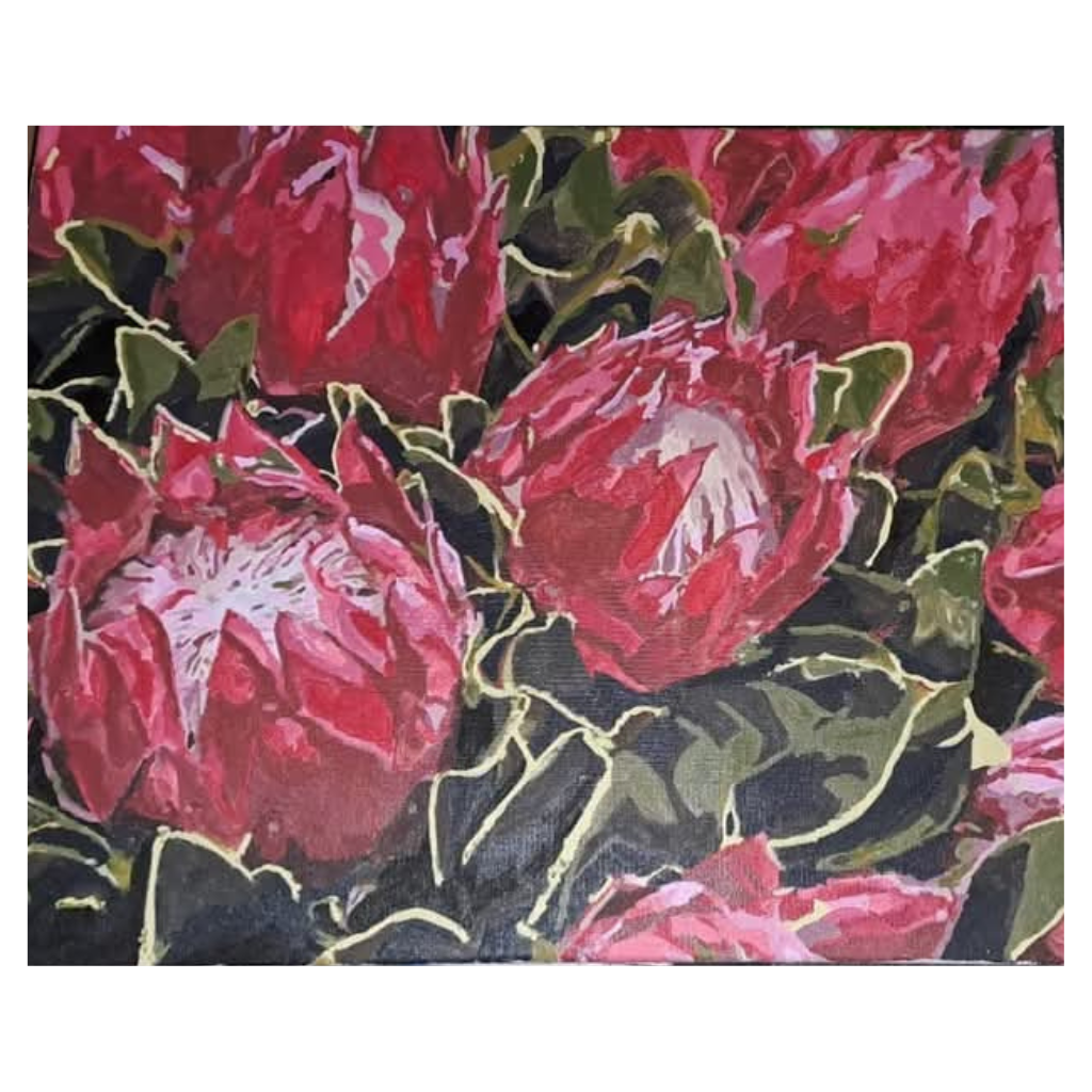 This stunning painting captures the bold and iconic beauty of the protea flower, South Africa’s national treasure. The rich shades of pink and deep green foliage create a striking contrast, bringing these blooms to life with incredible depth and texture. The artist’s attention to detail makes this piece a true celebration of nature’s elegance.