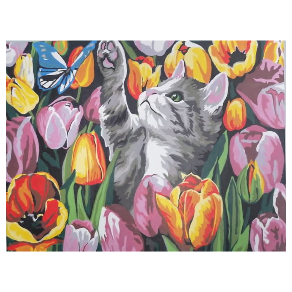 This delightful painting captures the innocence and curiosity of a playful kitten reaching for a fluttering butterfly amidst a vibrant sea of tulips. The artist’s masterful use of bold colors and soft shading brings this scene to life, evoking a sense of warmth, joy, and wonder.