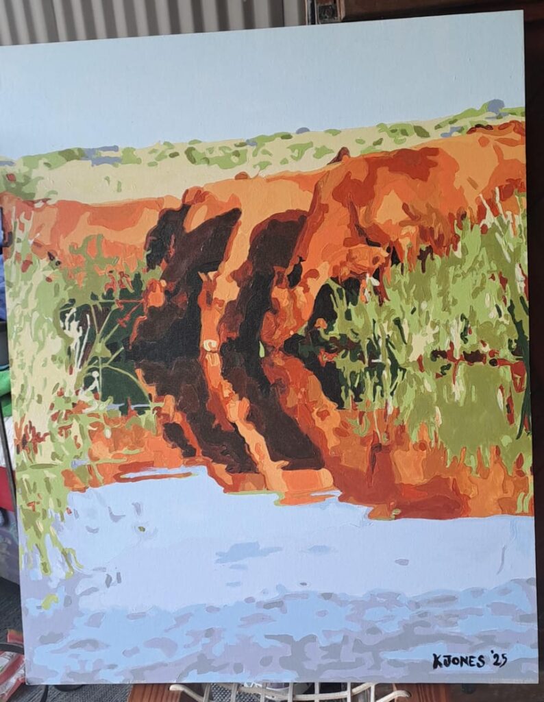 Immerse yourself in the raw beauty of nature with this striking landscape by Kevin Jones, a gifted artist known for his bold use of color and powerful brushwork. This piece captures the vivid contrast between sunlit red earth and deep shadows, reflected peacefully in a quiet stream — a moment of calm in the wild.